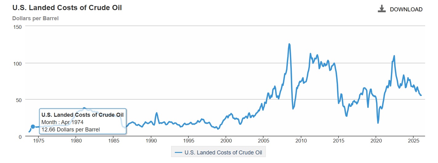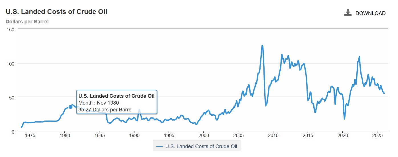 Der Ausgangspunkt war damals extrem niedrig. Um 1970 lag Öl noch auf einem Niveau von rund 1 bis 2 Dollar je Barrel. Nach dem ersten großen Schock im Umfeld von 1973/74 sprang der Markt auf über 11 Dollar. Der zweite Schock im Umfeld der islamischen Revolution im Iran trieb den Preis dann bis in eine Zone um 35 Dollar je Barrel. Entscheidend daran ist nicht historische Folklore, sondern die Größenordnung des Regimewechsels: von einem sehr niedrigen Ausgangsniveau erst auf ein neues Hochplateau und danach in eine nochmals deutlich höhere Preiszone.