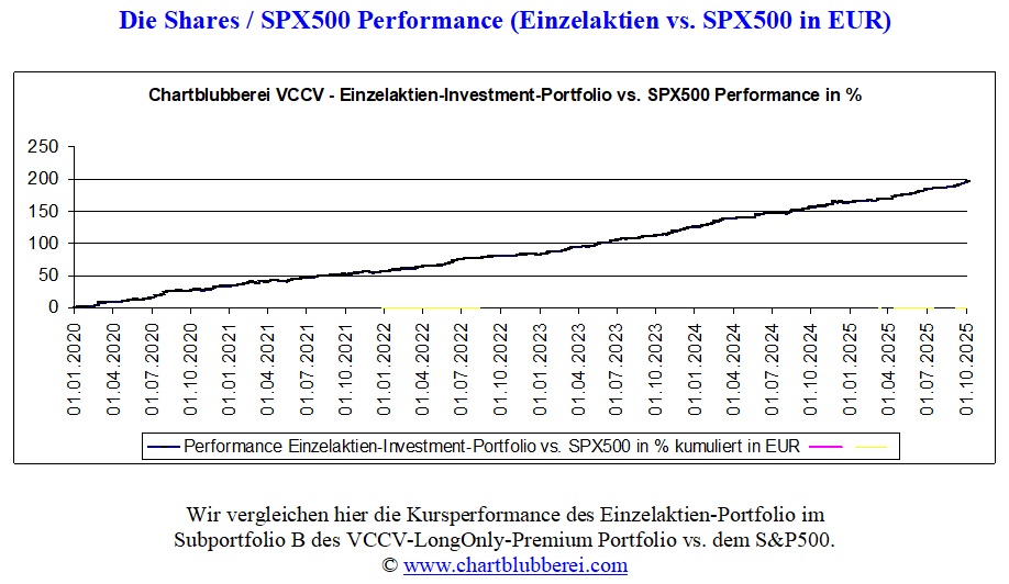 Ab Beginn 2020 haben wir begonnen jede Woche zu messen inwiefern unser Einzelaktienportfolio die Benchmark, den S&P500 outperformed. Ohne Trades, ohne Hedges und ohne Stock Picking sehen Sie das Ergebnis, monatlich aktualisiert hier. (Stand 05.10.2025 = +181,00%). Die hiesige Performance bezieht sich ausschließlich nur auf den Aktien-Investment Teil; also kaufen, halten und ab und zu umschichten. (Trade, Hedges, Stock Picking sind nicht in dieser Performance inkludiert. Dann wäre die Performance viel, viel höher. Nachzusehen unter Trackrecords).